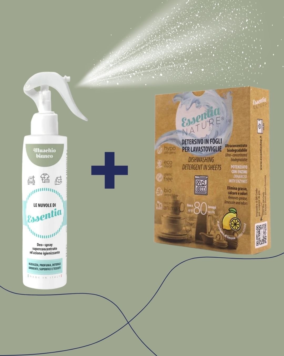 Essentia Nature ekologiškas rinkinys – indaplovių juostelės + dezinfekuojantis namų kvapas – valiklis „White musk“.