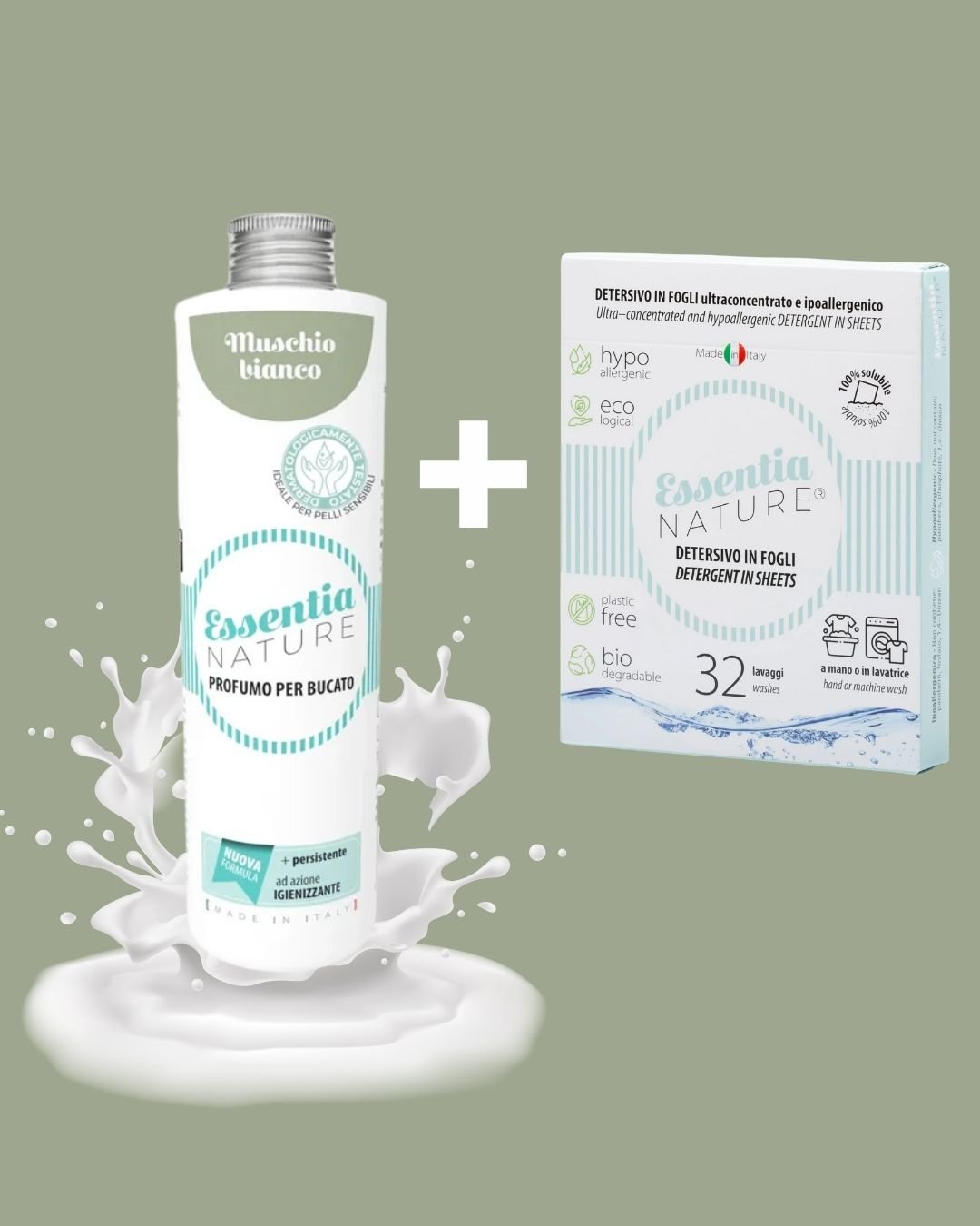 Essentia Nature ekologiškas skalbimo rinkinys – skalbimo juostelės + skalbinių kvapas „White musk“.